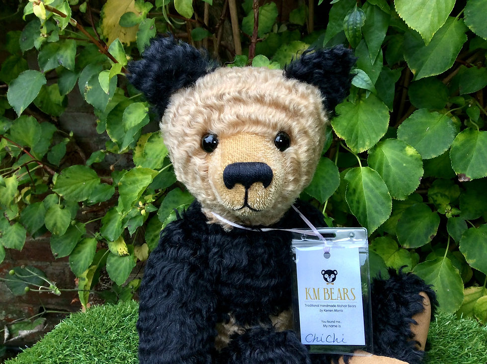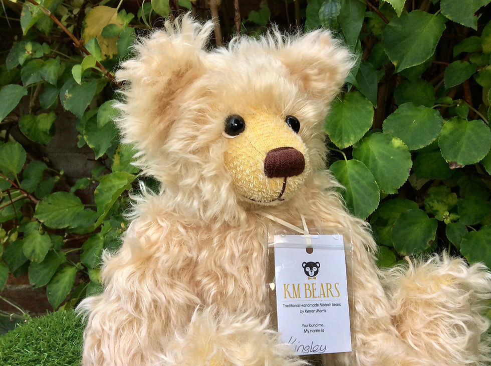 Kerren Morris has been designing and making bears since 1997. She is based in Farsley, Leeds, West Yorkshire, where you can find Kirkstall Abbey, the River Aire and the Yorkshire dales. All her bears are her own design and completely hand sewn, made mostly from mohair or alpaca, their foot and paw pads are made from ultra suede, leather or wool felt. They are fully jointed, filled with heavy polyester filling and contain pellets or steel pellets or both to give them a heavy and firm feel.